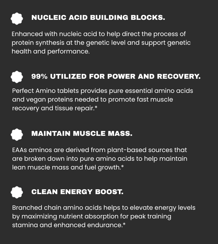 PERFECT AMINO® IS A PROPRIETARY BLEND OF ESSENTIAL AMINO ACIDS & NUCLEIC ACID BUILDING BLOCKS FOR OPTIMAL PROTEIN SYNTHESIS:
